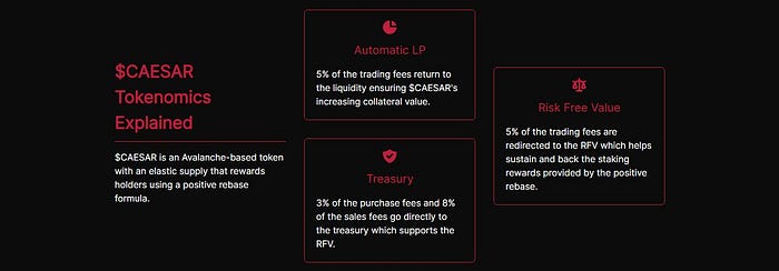 In simple terms, the staking rewards (rebase rewards) which are distributed every 30 minutes at a rate of 0.04189% are backed by the RFV parameter, thus ensuring a high and stable interest rate to $CAESAR holders.